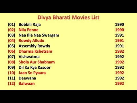 Divya Bharti Movies List - Movie List Divya Bharti - Divya Bharati Movies List I wish, I could upload all Divya Bharati Movies, but however there is an option to watch Divya Bharati full movies by visiting the relevant ...